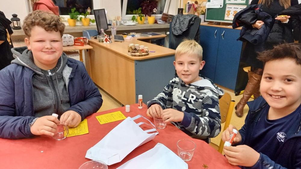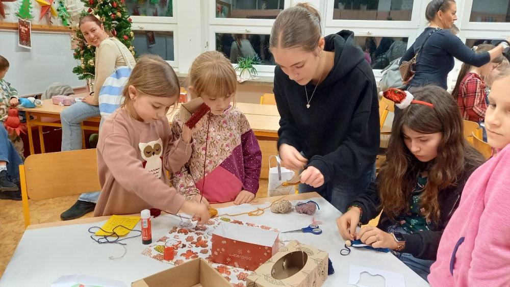 Děti z prvního stupně se s nadšením zapojily do různých tvořivých dílen. Pod vedením učitelů a s pomocí starších spolužáků vyráběly andělíčky z vlny, zdobily perníčky a dekorovaly svícny i vánoční baňky. Každý výrobek byl originálním výsledkem jejich fantazie a trpělivé práce.