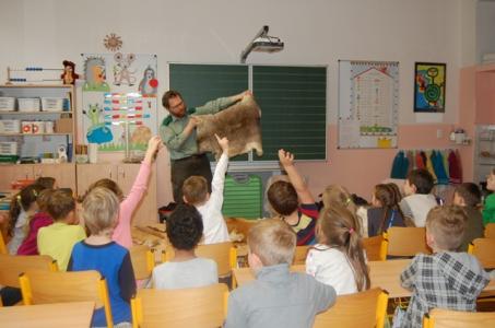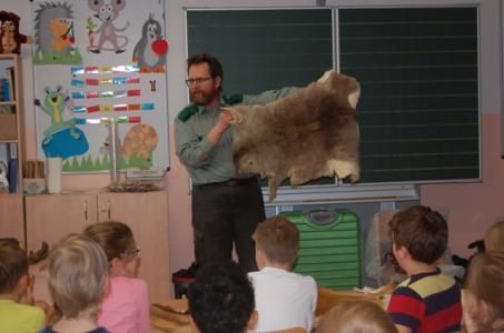 Pan Lanča poutavě vyprávěl o zvířatech žijících v lese, děti si mohly osahat trofeje kůží