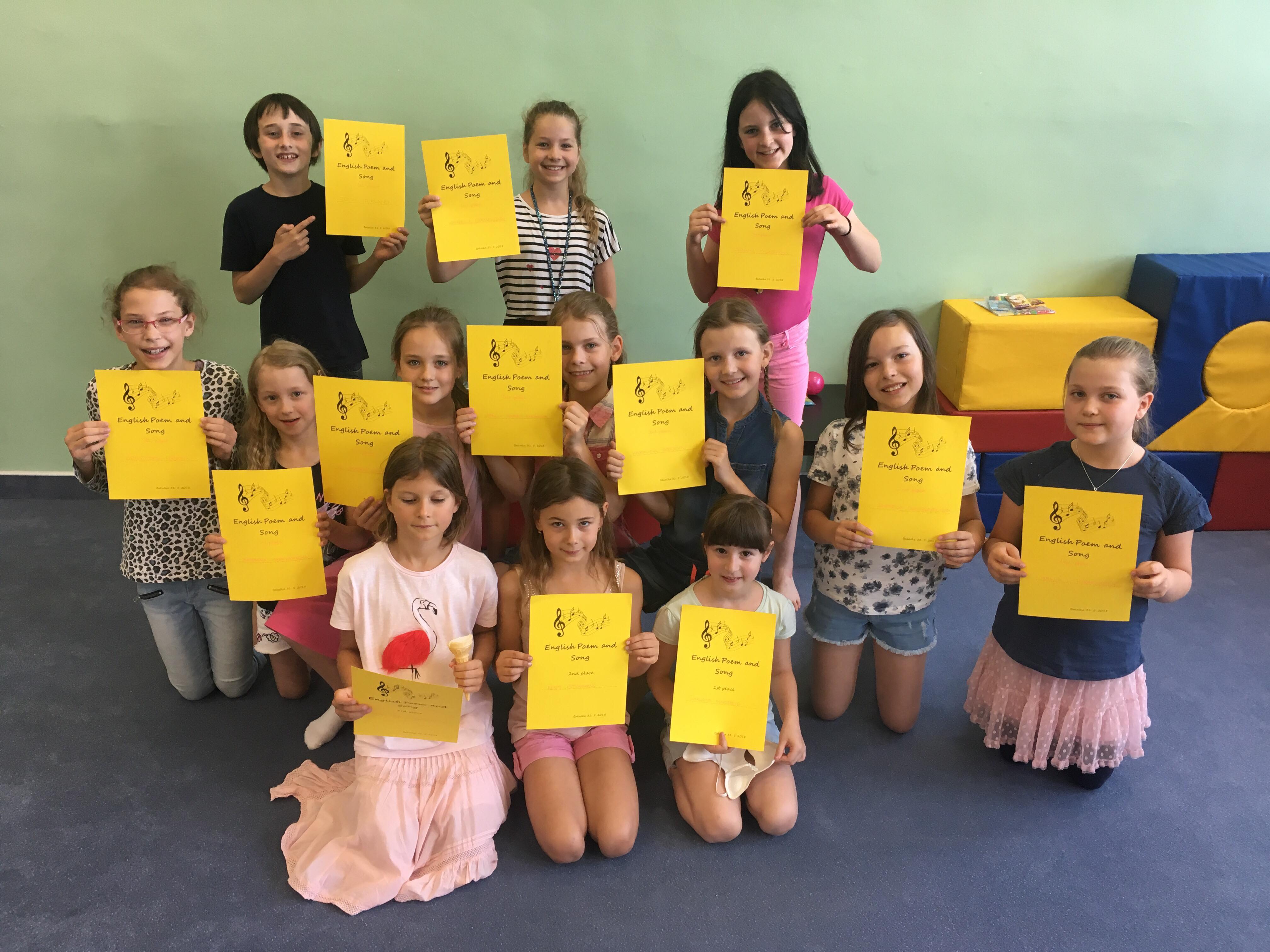 Dne 31. 5. se děti zúčastnily soutěže English Song and Poem. Všichni byli skvělí a obsadili první tři místa. Oceňujeme odvahu všech soutěžících a těšíme se na příští ročník.