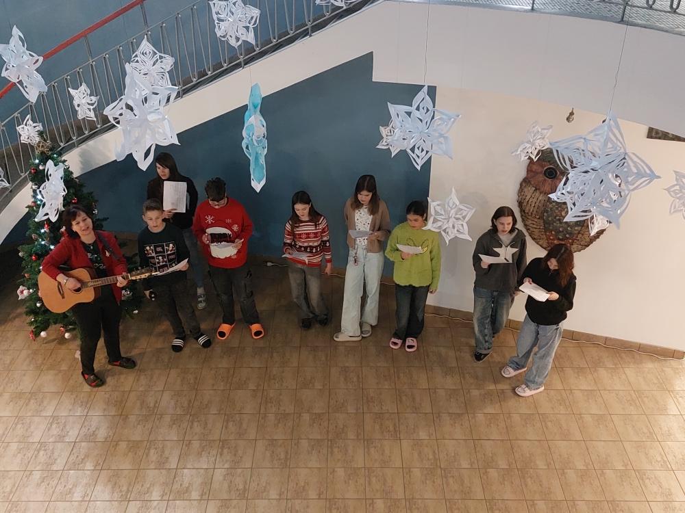 Poslední den před Vánoci nám opět školní kapela zpříjemnila vánočním zpíváním ve vestibulu školy.
