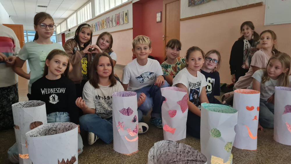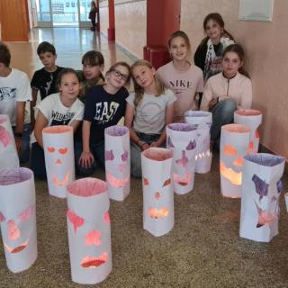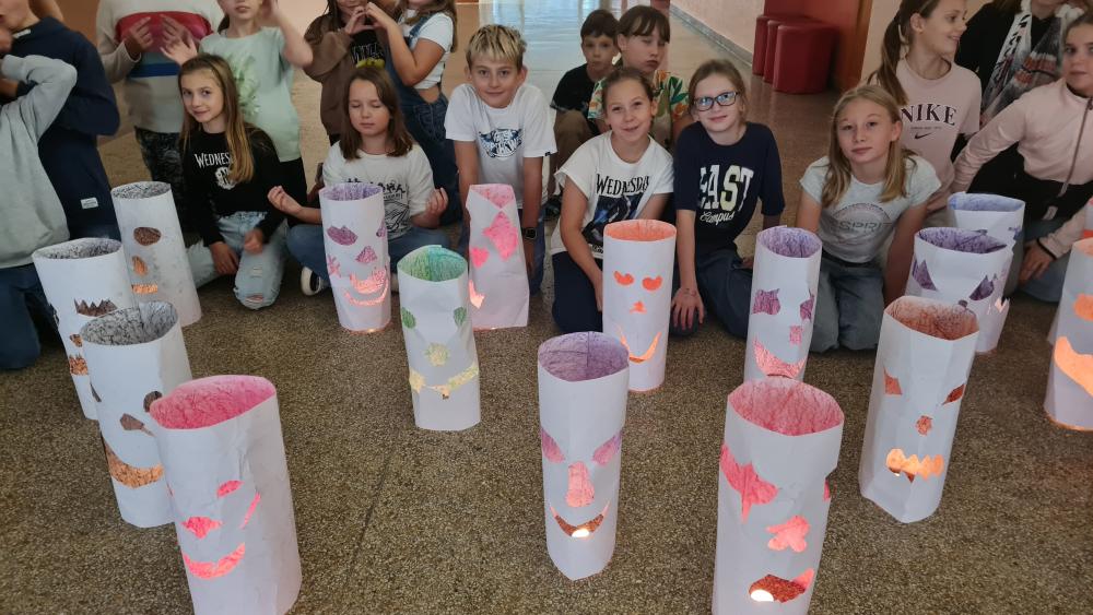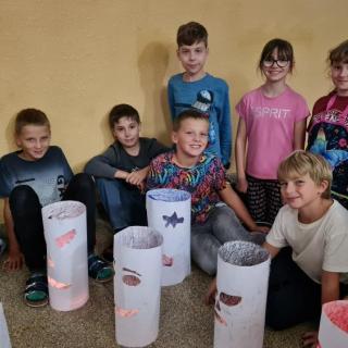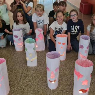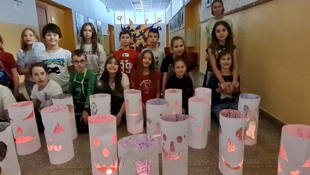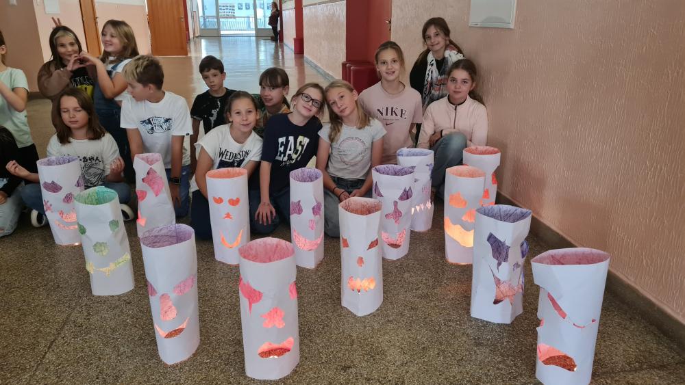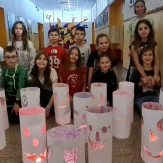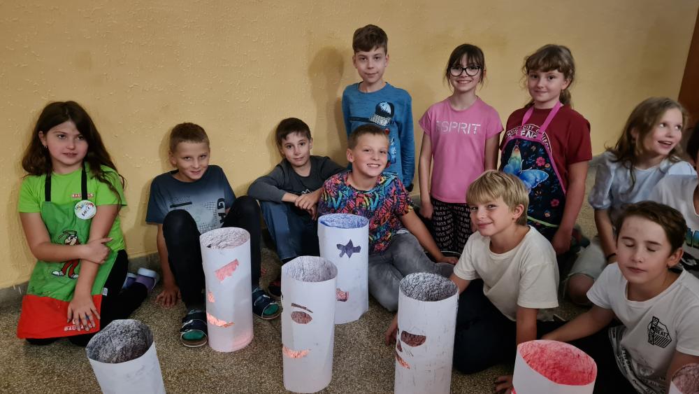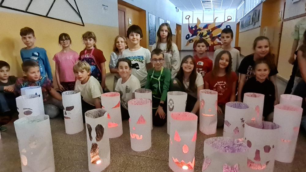 Minulý týden jsme se žáky pátých ročníků v rámci objektové tvorby zhotovili duchy. Jednoduchý papírový válec mohl být duchem hodným a usměvavým. Jiný duch mohl mít výraz zlý nebo nepříjemný. Do útrob každého ducha jsme vložili svíčky a už jsme se mohli trochu bát. Ale my se nebáli, protože duchové nejsou. Jen jsme se s nimi vyfotili.